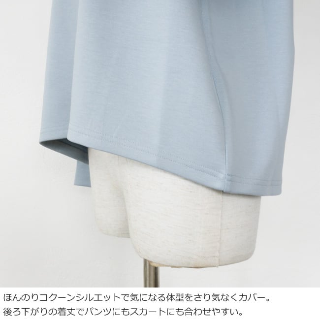 裾にかけてやや窄まったコクーンシルエットで気になる体型をさり気なくカバー。